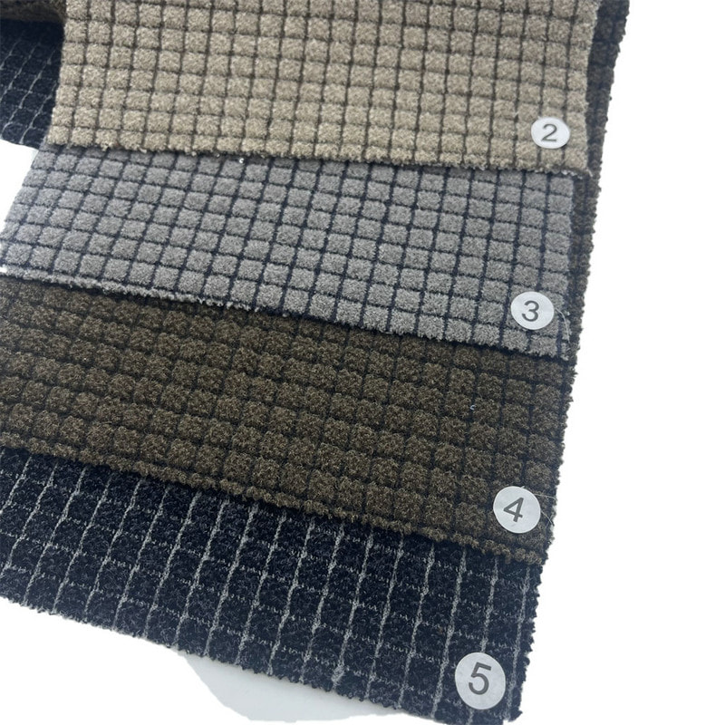 This fabric, article C24016, is a jacquard knit designed for upholstery applications. It is constructed from a blend of 87% polyester and 13% nylon, with a mass per unit area of 850g/m. The surface incorporates a check pattern created through jacquard knitting, combined with an embossed brushing technique that produces a three-dimensional tactile effect. This finishing process alters the fabric's surface texture, creating raised areas that define its hand feel. The specified fiber blend and construction method contribute to the fabric's durability and resistance to abrasion. These technical parameters make it applicable for furniture manufacturing and other interior applications.