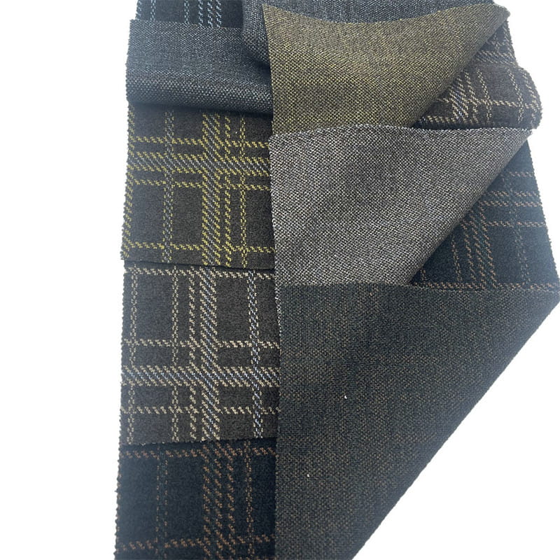 This fabric, article 24037, is a 100% polyester knit jacquard designed for pants. It features a fine-textured plaid pattern integrated into the construction during the knitting process. With a mass per unit area of 750g/m, the fabric possesses a defined structure and substantial density. The jacquard technique allows for the precise formation of the classical pattern directly into the fabric surface. This weight and composition contribute to the drape and durability of the material. The fabric's parameters make it applicable for tailored pants where a defined silhouette and surface interest are required.