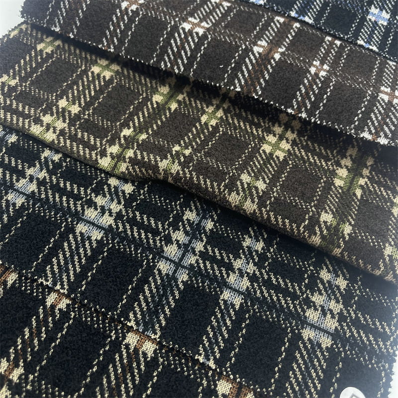 This fabric, designated as article 240236, is a heavyweight plaid knit constructed from 100% polyester. With a mass per unit area of 740g/m, the material exhibits substantial thickness and density. The plaid pattern is integrally formed during the knitting process, creating a consistent surface texture. The polyester composition contributes to the fabric's structural integrity and dimensional stability. This combination of weight and construction results in a textile with inherent opacity and wind resistance, making it applicable for outerwear garments such as jackets where these physical properties are functional requirements.