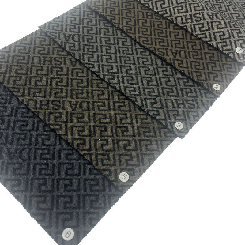 This fabric, designated as article T24067A, is a jacquard textile constructed from a blend of 84% polyester and 16% nylon. With a mass per unit area of 850g/m, the material exhibits substantial density and structural integrity. The surface features a repeated jacquard pattern that is integrated directly into the fabric construction during the weaving process. This fabric is configured to accommodate logo customization within its pattern repeat, allowing for the incorporation of brand identifiers directly into the textile structure. The specified fiber composition contributes to the fabric's dimensional stability and durability, making it applicable for various clothing applications where these technical properties are required.