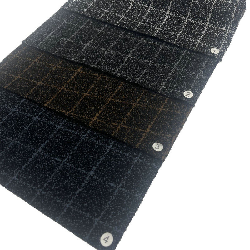 This fabric, article 182808-1, is a knit textile designed for blazer manufacturing. It is constructed from a fiber blend of 65% polyester, 27% nylon, 6% acrylic, and 2% wool, with a mass per unit area of 820g/m. The surface integrates a combined plaid and dots pattern formed during the knitting process. This specific fiber composition creates complementary characteristics: the polyester provides structural stability, the nylon enhances durability, the acrylic contributes to loft, and the wool influences the fabric's hand feel. The substantial weight and knit construction contribute to the fabric's drape and insulation properties, making it applicable for structured garments such as blazers.