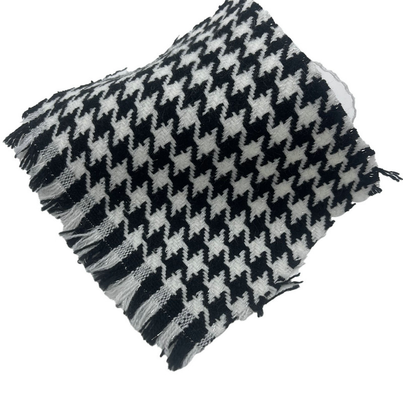 This fabric is a jacquard tweed textile composed of 97% acrylic and 3% silver thread, with a mass per unit area of 250 gsm. It features a black and white houndstooth pattern integrated with metallic elements during the jacquard weaving process. The acrylic base provides structural consistency and color retention, while the silver thread introduces light-reflective properties to the pattern. This construction creates a fabric with defined geometric motifs and surface contrast. The specified weight and composition contribute to the material's durability and ease of maintenance. These technical characteristics make this jacquard tweed applicable for upholstery projects where pattern visibility and functional performance are required.