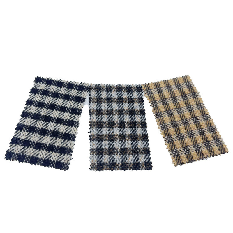 This fabric, designated as article 3811, is a tweed textile composed of 10% wool and 90% other fibers. With a mass per unit area of 550 g/m, it presents a heavyweight construction. The brown surface features a check pattern integrated into a twill weave base, creating diagonal lines beneath the grid formation. A brushing finish has been applied to the fabric, raising fibers to create a softened surface texture. This technique alters the fabric's tactile properties while maintaining the structural integrity of the twill weave. The technical specifications result in a material with combined visual pattern definition and enhanced surface hand feel, making it applicable for coat manufacturing where both durability and tactile comfort are required.