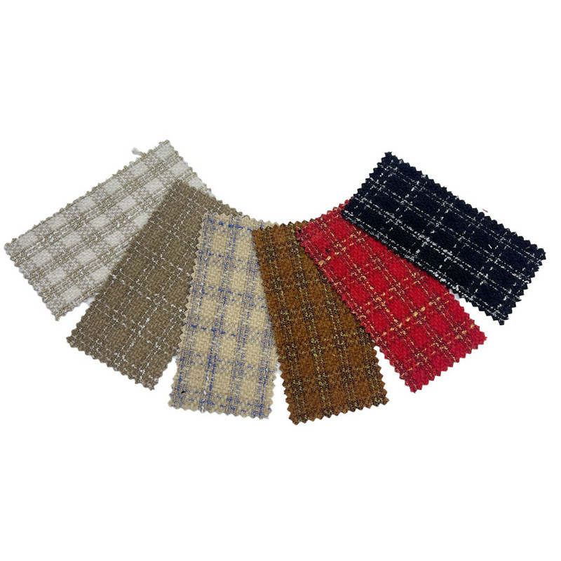This fabric, designated as article 3764, is a woven tweed textile composed of 100% other fibers. With a mass per unit area of 560 g/m, it presents a medium-to-heavy weight construction. The surface combines a check pattern with a chenille structure that has undergone a brushing process. This finishing technique raises fibers from the chenille yarns, creating a soft surface texture. The check design is formed through the interplay of colored yarns in the weaving process, maintaining geometric precision. These manufacturing techniques result in a fabric with both visual pattern definition and a distinctive tactile quality. This woven tweed is applicable for women's clothing where surface interest and structural integrity are required.