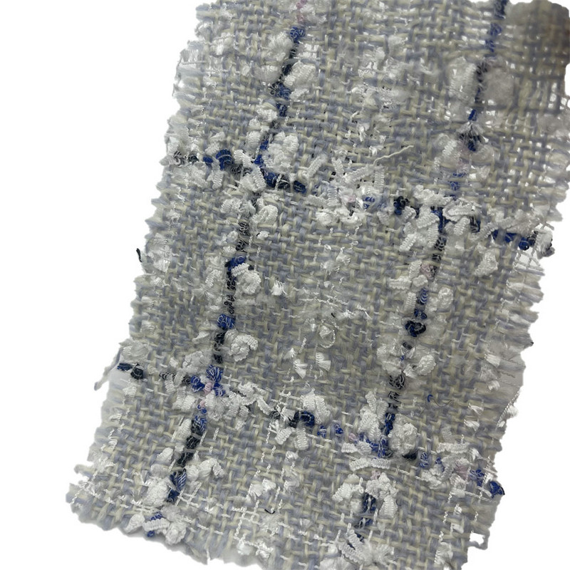 This fabric, designated as article 23510, is a tweed textile composed of 45% wool and 55% polyester. With a mass per unit area of 425 gsm, it presents a medium-weight construction suitable for coats. The fabric features a blue, grey, and white plaid pattern, integrated with a butterfly motif during the weaving process. This combination creates a layered visual effect within the textile structure. The wool and polyester blend contributes to the fabric's dimensional stability and thermal properties. These technical characteristics make this tweed applicable for outerwear garments where pattern complexity and structural integrity are required.