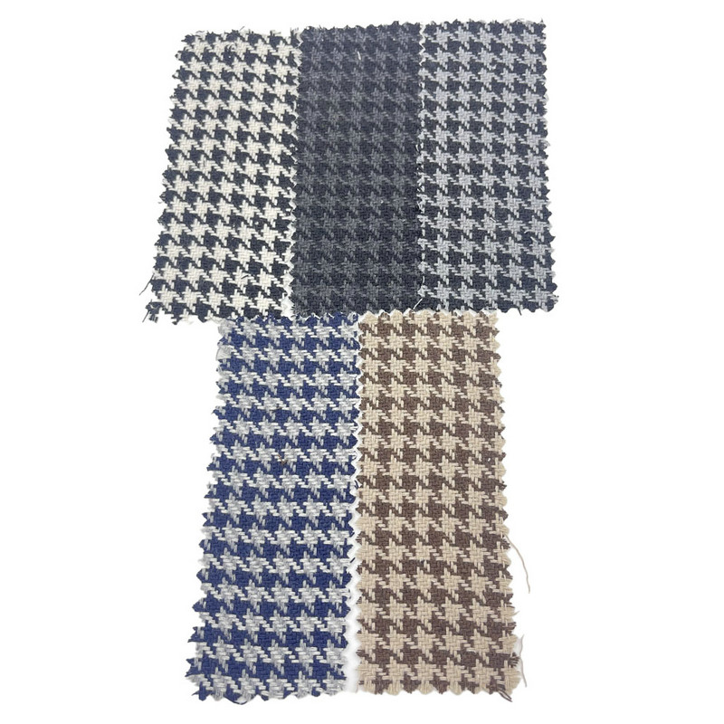 This fabric, designated as article 3946, is a woven textile composed of 10% wool and 90% other fibers. With a mass per unit area of 450 g/m, it presents a medium-weight construction. The dark grey surface features a houndstooth pattern, created through a specific weaving technique that produces broken checks or four-pointed shapes. This classic geometric motif is characterized by its repeating contrasting tonal effect. The wool blend composition contributes to the fabric's thermal regulation and resilience. These technical characteristics result in a material with defined pattern articulation and structural durability, making it applicable for hoodies where visual pattern definition and long-term performance are required.