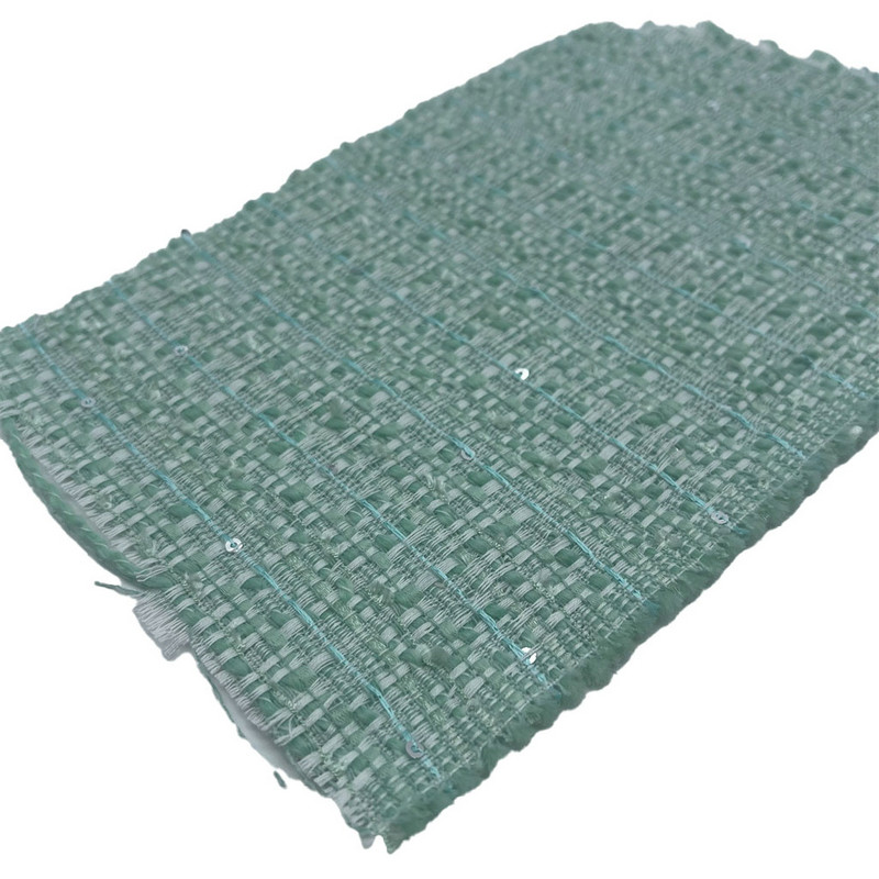 This fabric, designated as article 22102, is a jacquard tweed textile composed of 90% polyester and 10% wool. With a mass per unit area of 320 gsm, it presents a lightweight construction suitable for dresses. The light green base features an embossed jacquard pattern, where sequins are integrated during the weaving process to create localized reflective areas. The high polyester content ensures dimensional stability and shape retention, while the wool component contributes to the fabric's tactile properties. This combination results in a material with surface texture variation and structural consistency. These technical characteristics make this jacquard tweed applicable for dresses where decorative surface interest and garment structure are required.