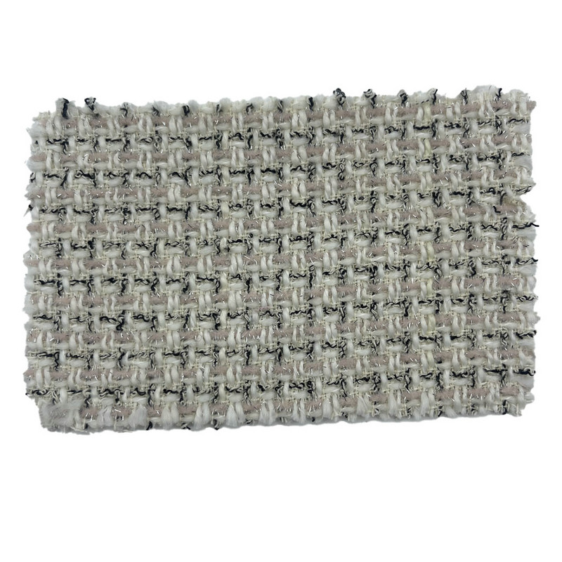 This fabric, designated as article 23523, is a tweed textile composed of 78% polyester, 12% wool, and 10% cotton. With a mass per unit area of 440 gsm, it presents a medium-weight construction suitable for dresses. The light pink base features a check pattern integrated with metallic yarn during the weaving process. This combination creates a contrast in both visual appearance and light reflection. The blend of polyester, wool, and cotton contributes to the fabric's dimensional stability, thermal regulation, and moisture management. These technical characteristics make this tweed applicable for fashion dresses where pattern definition and material performance are required.