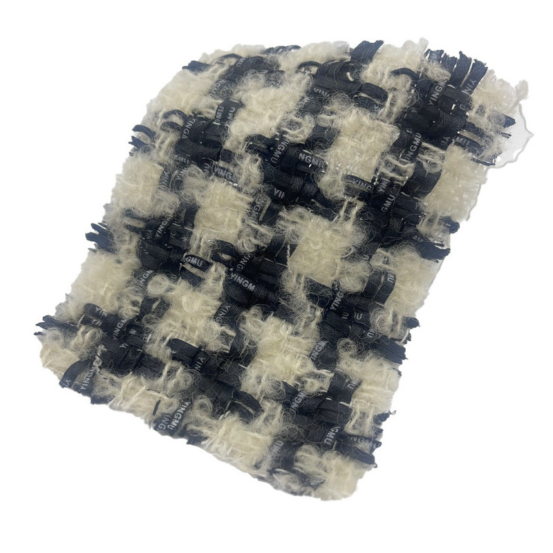 This fabric, designated as article 23548, is a wool tweed textile composed of 38% polyester, 36% wool, and 26% cotton. With a mass per unit area of 410 gsm, it presents a medium-weight construction. The off-white and black color scheme is woven into a plaid pattern, enhanced by a surface brushing technique that creates a raised teddy-like texture. This finishing process forms a dense, short-pile surface that alters the fabric's tactile properties. The fiber composition contributes to the fabric's structural stability and moisture management. These characteristics make this brushed tweed applicable for garments requiring both visual pattern definition and distinctive surface texture.