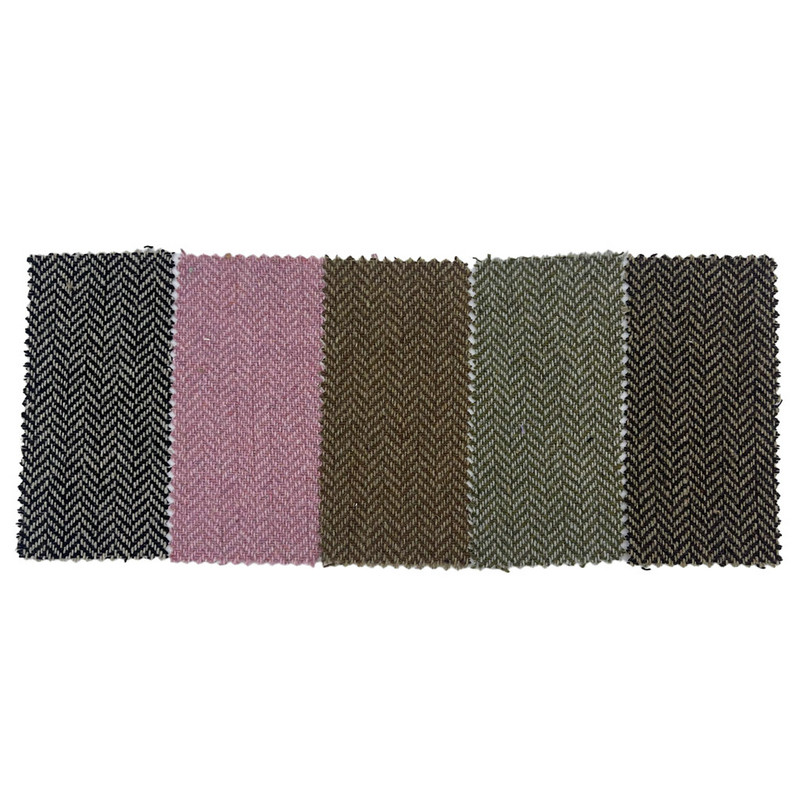This fabric, designated as article 3532, is a jacquard textile composed of 20% wool and 80% other fibers. With a mass per unit area of 500 g/m, it presents a medium-to-heavy weight construction. The pink surface features a herringbone pattern created through the jacquard weaving process, which forms precise V-shaped motifs across the fabric. This technique produces a consistent directional texture with defined geometric repetition. The wool blend composition contributes to the fabric's thermal properties and shape retention. These technical characteristics result in a material with structural density and pattern clarity, making it applicable for pants where both visual definition and dimensional stability are required.
