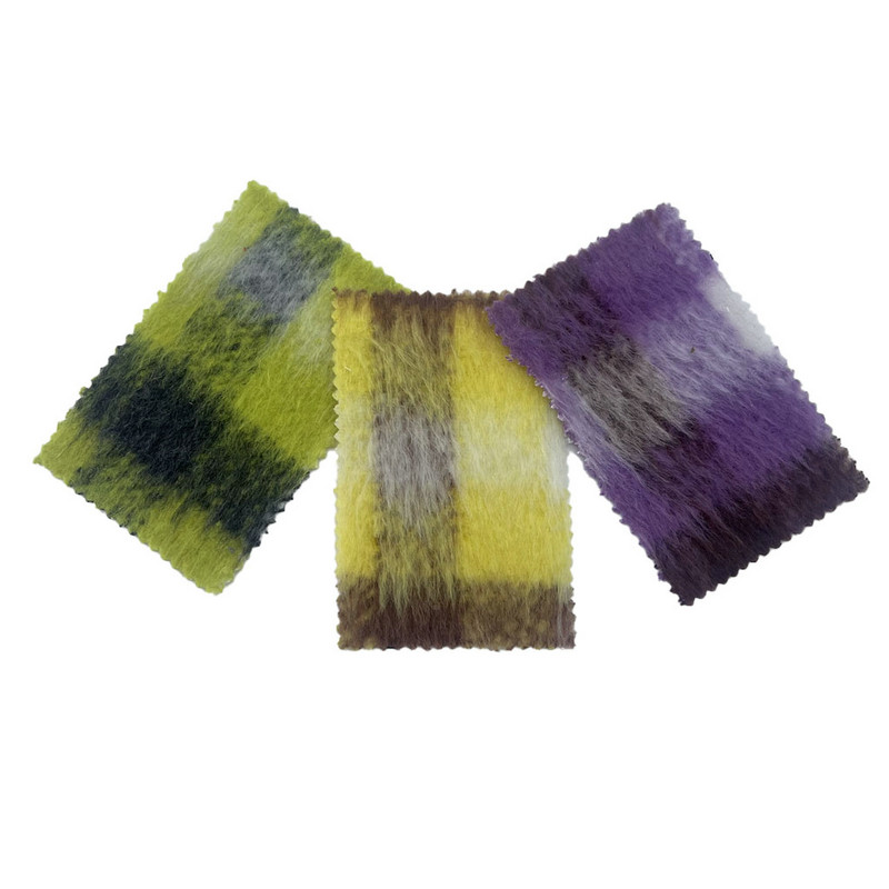 This fabric, designated as article 3256, is a tweed textile composed of 20% wool and 80% other fibers. With a mass per unit area of 700 g/m, it presents a heavyweight construction. The purple surface features a plaid pattern integrated with a long pile texture, creating a composite structure through specialized weaving and finishing processes. This manufacturing technique produces extended fiber length on the surface, resulting in a pronounced three-dimensional effect. The wool blend composition contributes to the fabric's thermal insulation properties and structural resilience. These technical characteristics result in a material with substantial volume and surface depth, making it applicable for overcoats where elevated warmth and textural presence are required.