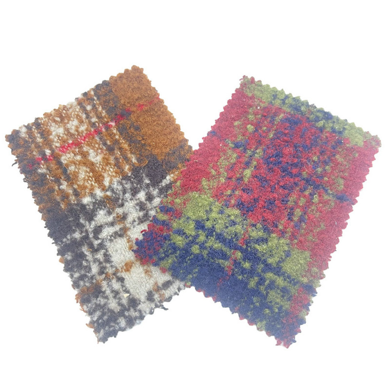 This fabric, designated as article 3851, is a jacquard tweed textile composed of 10% wool and 90% other fibers. With a mass per unit area of 520 g/m, it presents a medium-to-heavy weight construction. The surface features a tartan plaid pattern created through the jacquard weaving process, forming precise intersections of colored stripes. A brushing finish has been applied to create a raised teddy-like texture, altering the fabric's surface characteristics. This technique results in a dense, short-pile surface that modifies both visual depth and tactile properties. The technical specifications make this fabric applicable for jacket manufacturing where defined pattern articulation and distinctive surface texture are required.