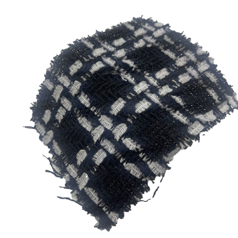 This fabric, designated as article 23545, is a woven tweed textile composed of 39% polyester, 36% wool, and 25% cotton. With a mass per unit area of 255 gsm, it presents a lightweight construction. The fabric features a black plaid pattern created through the weaving process, forming a structured grid on the surface. The blend of polyester, wool, and cotton combines the dimensional stability of synthetic fibers with the natural moisture management of cellulosic and protein fibers. This composition results in a fabric with balanced durability and breathability. These technical specifications make this woven tweed applicable for various clothing applications where pattern definition and wear comfort are required.