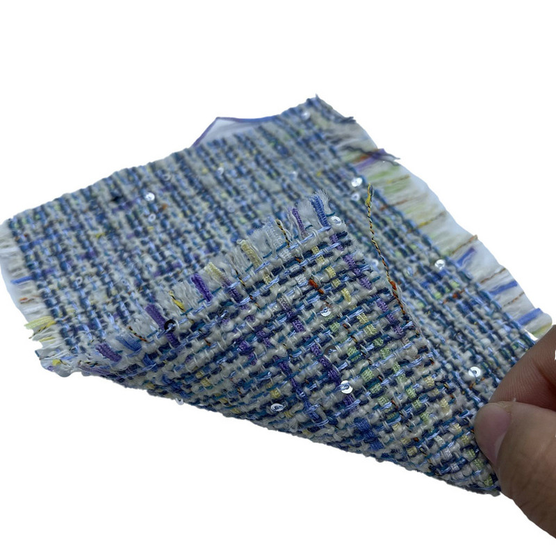 This fabric, designated as article ZZH24018, is a tweed textile composed of 20% wool and 80% polyester. With a mass per unit area of 560g/m, the material presents a medium-weight construction. The fabric incorporates metallic sequins fixed within the tweed structure, creating intermittent light reflection across the surface. The wool and polyester blend provides a balance between natural fiber characteristics and structural consistency. This combination results in a material with surface texture variation and dimensional stability. These specifications make this tweed fabric applicable for women's dress coats where both visual interest and practical performance are considered.